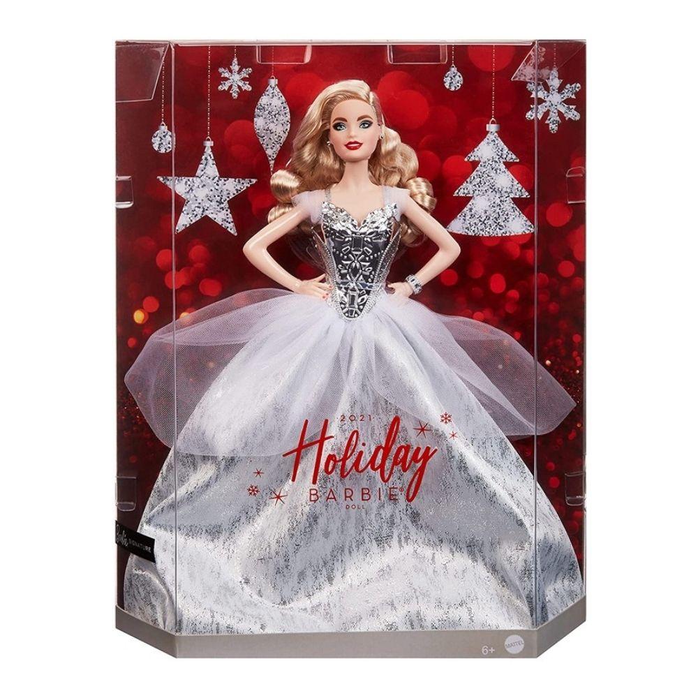 The 2021 Merry Christmas Barbie doll reflects the magic of the season wearing a gorgeous dress, sparkling with sophisticated glamor.