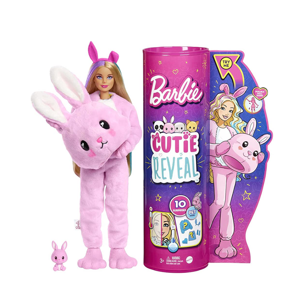 Unleash your imagination with the Barbie Cutie Reveal Doll 1- Bunny by Mattel! This adorable doll features a removable bunny suit that reveals Barbie's cute outfit underneath. With endless dress-up possibilities, this doll inspires creativity and offers hours of fun playtime. Bring home the magic of Barbie today!