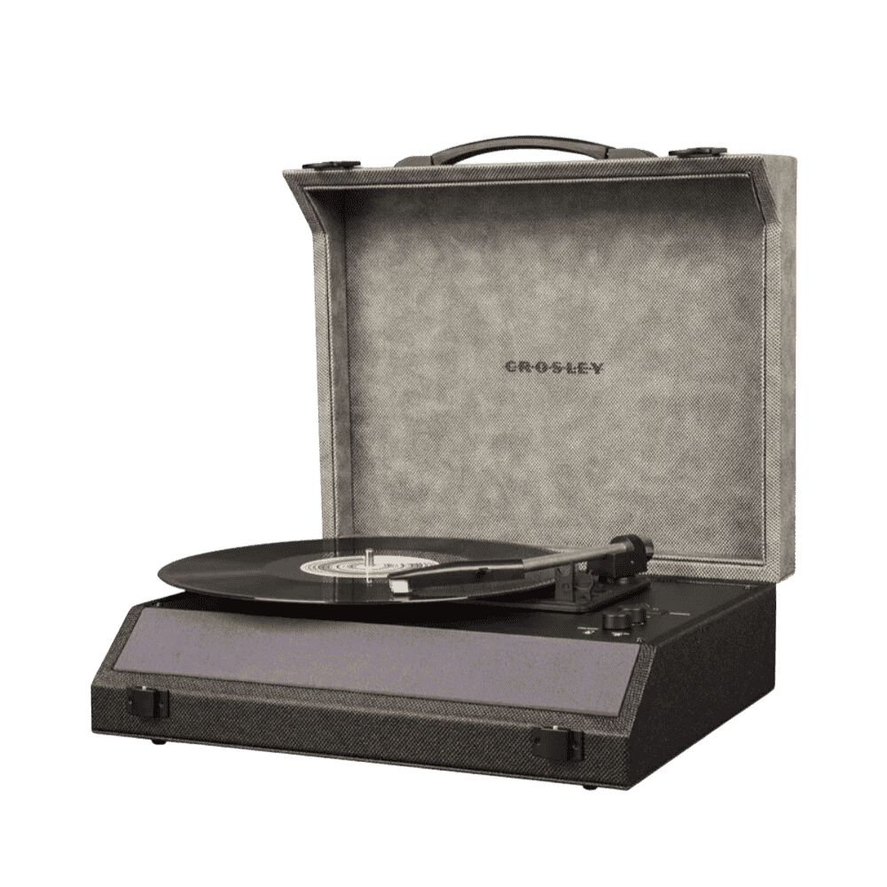 Crosley is switching up the typical portable turntable silhouette with the two-tone asymmetrical design of the Momento Turntable. Open the lid to reveal the angled built-in stereo speakers and the minimalistic turntable components. Two knobs control volume and pitch while you can easily toggle between 33 1/3, 45 and 78 RPM with the speed selector switch. The Momento features an aluminum tone arm fitted with a moving magnet cartridge