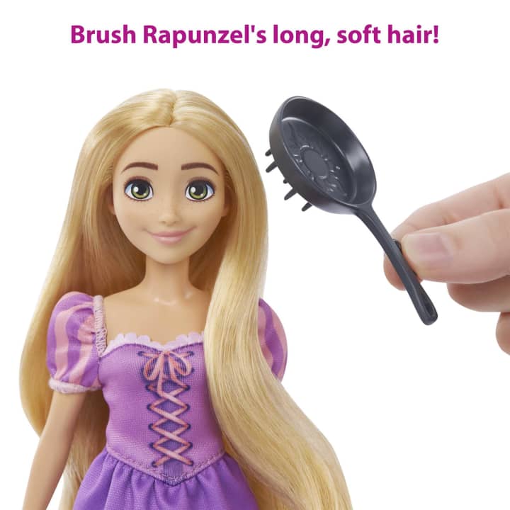 • Rapunzel features long hair and a frying pan brush for lots of brushing and styling fun!