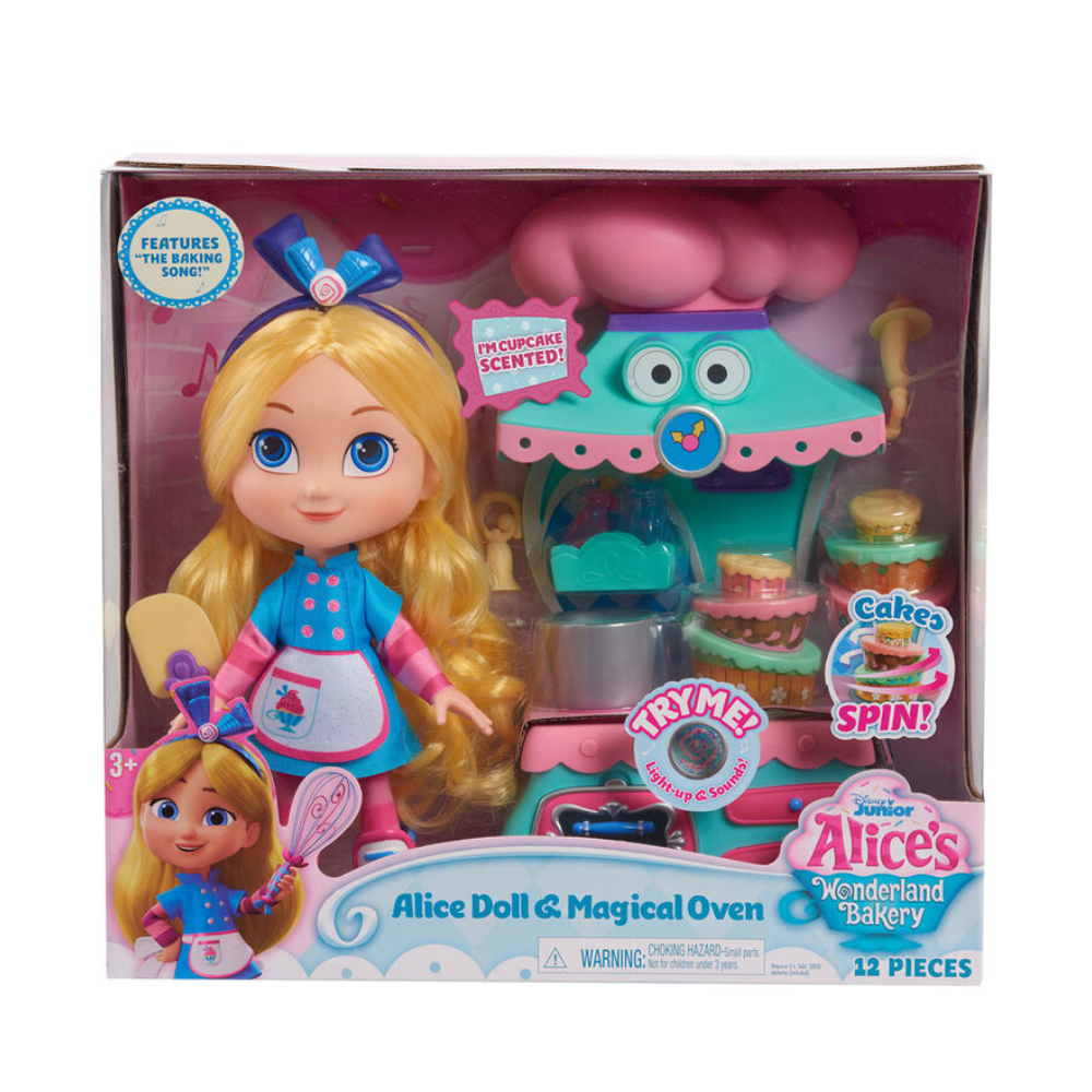 • Includes: 10-inch Alice doll, 1 magical oven toy, pot, 2 stackable layer cakes, 2 spice jars, 1 spatula. Whip up creative recipes and lots of fun with the Disney Junior Alice's Wonderland Bakery Alice and Magical Oven Set, which features a light-up oven with phrases and sound effects from the show, including the "The Baking Song."