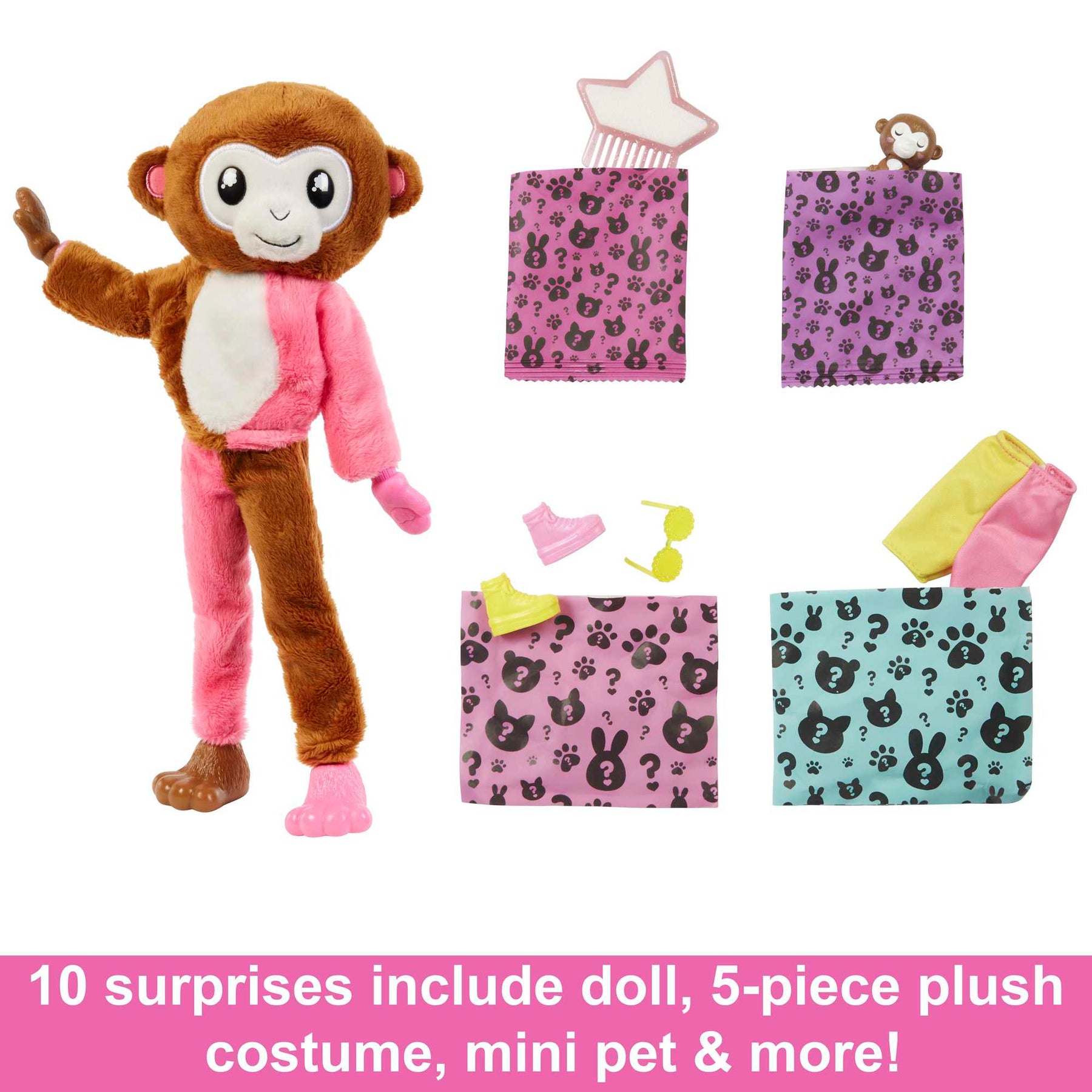 • Unbox to find a cheeky, plush monkey with a Barbie® doll inside. Which doll will you reveal?