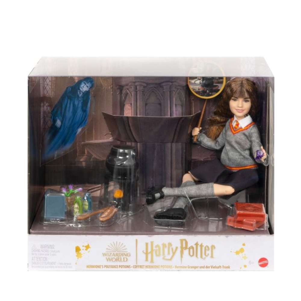 With Harry Potter Hermione's Polyjuice Potions Doll, fans can relive an iconic movie moment or play out their own spellbinding stories! With 10 film-inspired accessories, Hermione Granger doll has everything she needs to ace Potions Class, including her personalized wand and a cauldron lit by a "flame." Hermione doll looks just like her onscreen character in her signature Hogwarts uniform -- and with articulation at the neck, shoulders, hips, knees, elbows and wrists, she's ready for magical storytelling play! Collectors and kids ages 6 years old and up can collect more Harry Potter dolls and toys to build out the wizarding world. Each sold separately, subject to availability. Doll cannot stand alone. Colours and decorations may vary.