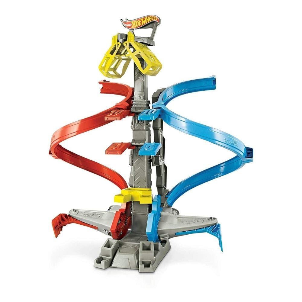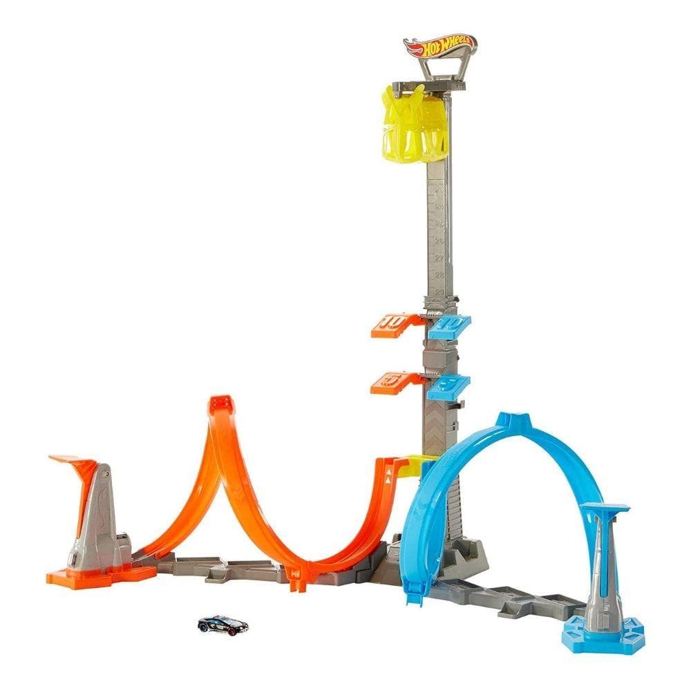 Hot Wheels Loop & Launch Track Set takes competition to new heights as cars race to a winner's cage that can reach up to two feet in the air! Vehicles speed through a helix loop then launch toward the looming cage that snaps closed when a car reaches it. The cage is adjustable and can be raised or lowered depending on the desired level of competition - a series of point panels along the trajectory adds to the excitement of the challenge. Each track unhooks and snaps into place for super simple set-up, then easily collapses for convenience storage.