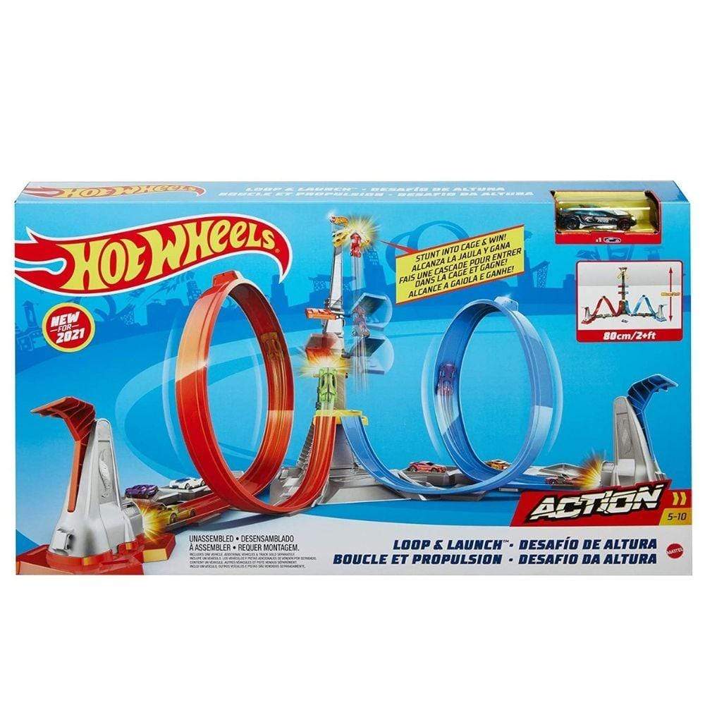 It's a race to the winner's cage in the Hot Wheels Loop & Launch Track Set! Cars race along the tracks, and through a loop that propels cars to a cage that can reach up to 2 feet in the air!