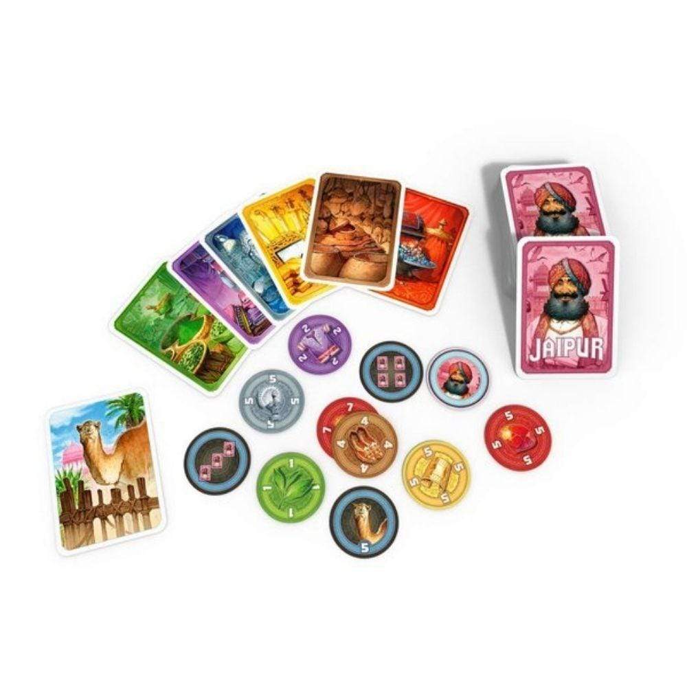 Jaipur is a fast-paced card game, a blend of tactics, risk and luck. On your turn, you can either take or sell cards. If you take cards, you have to choose between taking all the camels, taking one card from the market, or swapping 2-5 cards between the market and your cards.