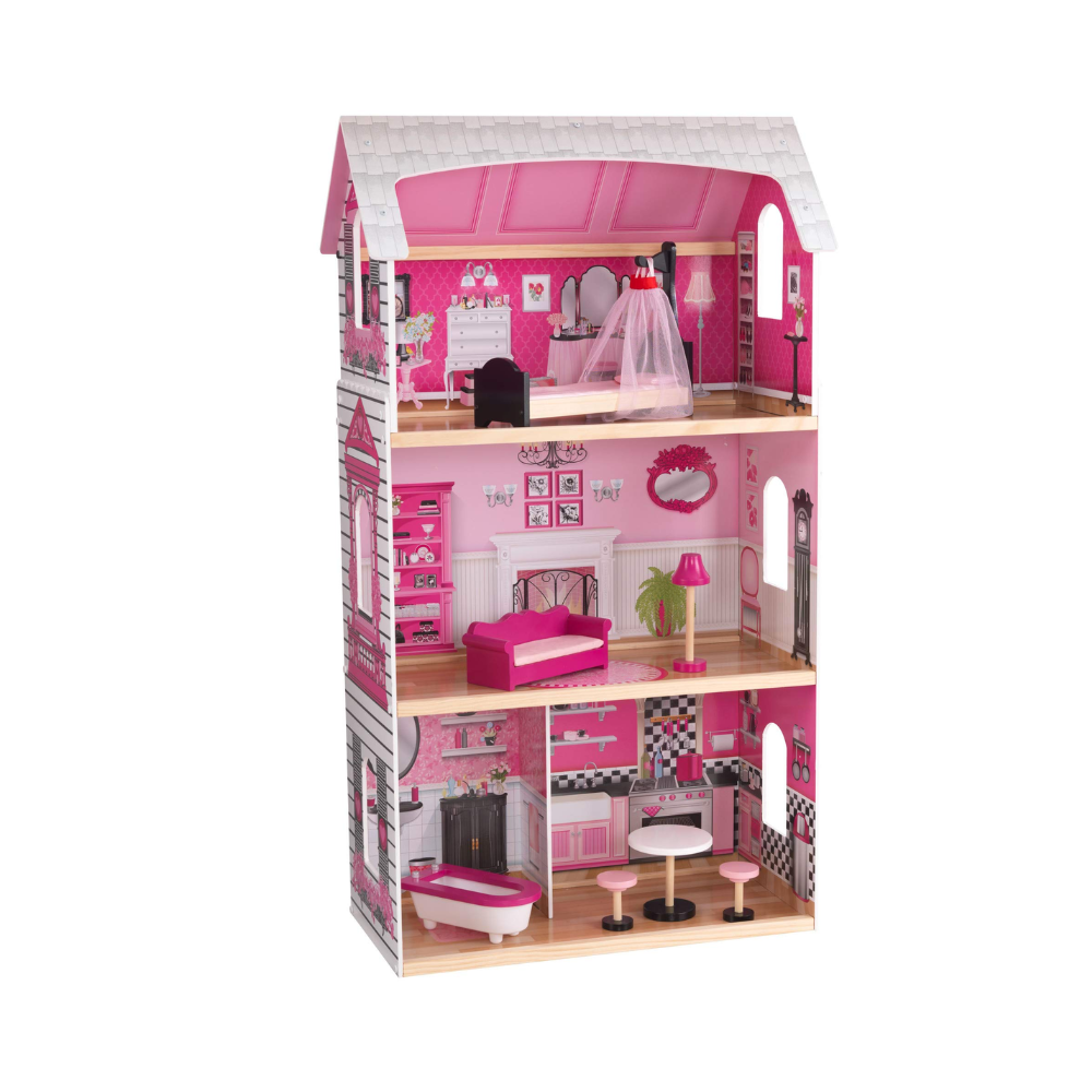 The KidKraft Bonita Rosa Dollhouse is over three feet tall, with three levels and four rooms to play and decorate for all your 12 inch dolls. The seven-piece accessory kit features hand-painted furniture to match the richly-illustrated rooms’ pink and white motif. As a fun bonus, this real wooden dollhouse includes letter stickers so kids can personalize Bonita Rosa and make it their own. This dollhouse is a carefully crafted toy playset with wood and sturdy molded plastic to provide generations of imaginative fun.