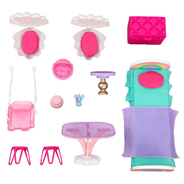 15 total furniture & play pieces, including exclusive mouse unicorn friend (additional furniture and playsets sold separately to extend the fun). Three levels, 7 play areas, including 2 balconies. Clamshell chairs provide a "shelltastic" place to sit.Levels of Play: 3. Fits up to (Doll Size) 12"/ 30 cm