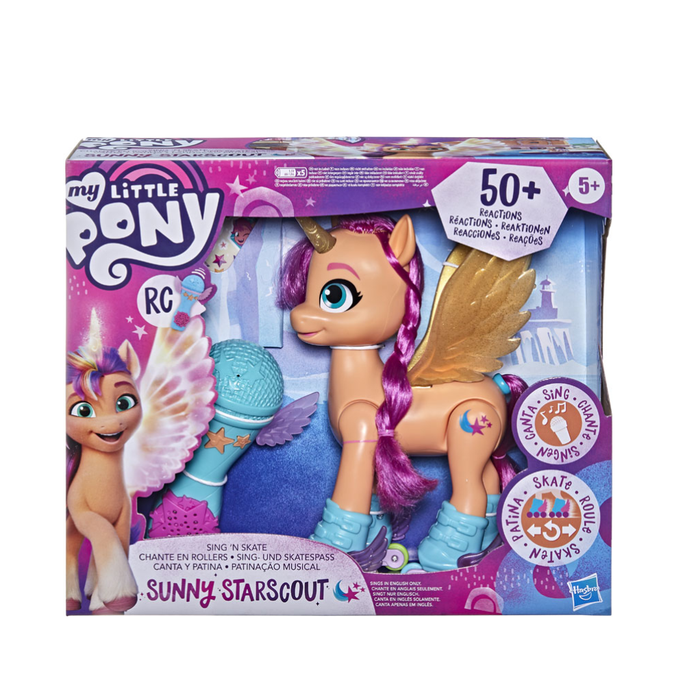 Get to know Sunny Starscout: an adventurous pony from Maretime Bay! Sing 'N Skate Sunny Starscout is an interactive pony figure that children can control. Comes with a cordless microphone that can be used for singing or as a remote control. Use the buttons on the microphone to move the figure forward or spin her around. Children can also shake the RC microphone to make the figure move! The figure moves her heads and wings while she skates and sings part of the song 'Gonna Be My Day'. Features over 50 combinations of lights, sounds and movement. This 22.5-cm orange pony figure has long, soft pink hair and a character-inspired shooting star cutie mark on one side. Fans both new and old can imagine adventures with My Little Pony: A New Generation film-inspired toys. Makes a great festive gift or birthday present for children aged 5 years and up! My Little Pony and all related characters are trademarks of Hasbro
