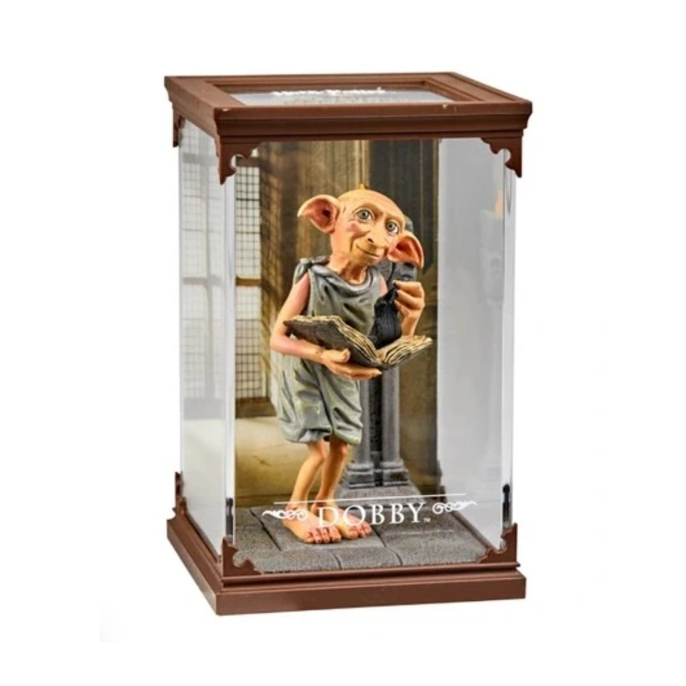 A finely crafted, hand-painted plastic sculpture of Dobby the house elf, enslaved to the Malfoys from whom he eventually escaped to become the devoted friend of Harry Potter; so devoted he died saving Harry’s life.