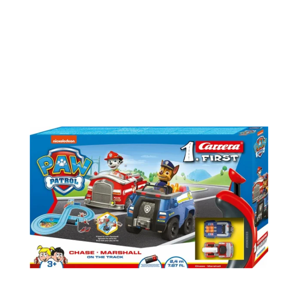 Get Chase and Marshall into a head-to-head racing battle with the Carrera First PAW Patrol On the Track Playset