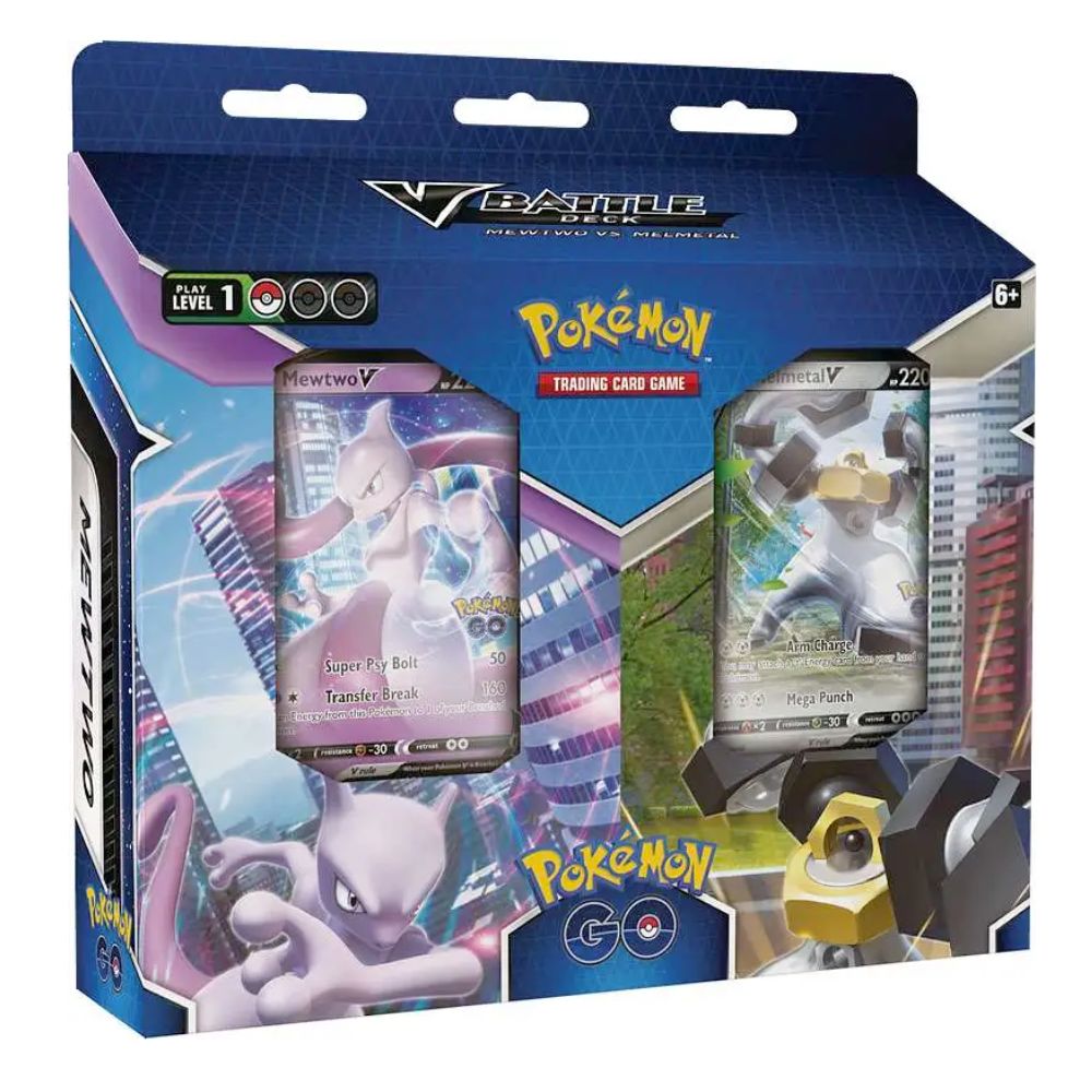 Unleash mental might or metal mayhem with a deck led by Mewtwo V or Melmetal V with Pokémon TCG: Pokémon GO V Battle Decks. Mewtwo V leads an elusive team of Psychic-type Pokémon, while Melmetal V brings the crushing power of Metal types. Land quick hits turn after turn, keep Energy in play, and master all the tricks of these two V Battle Decks!