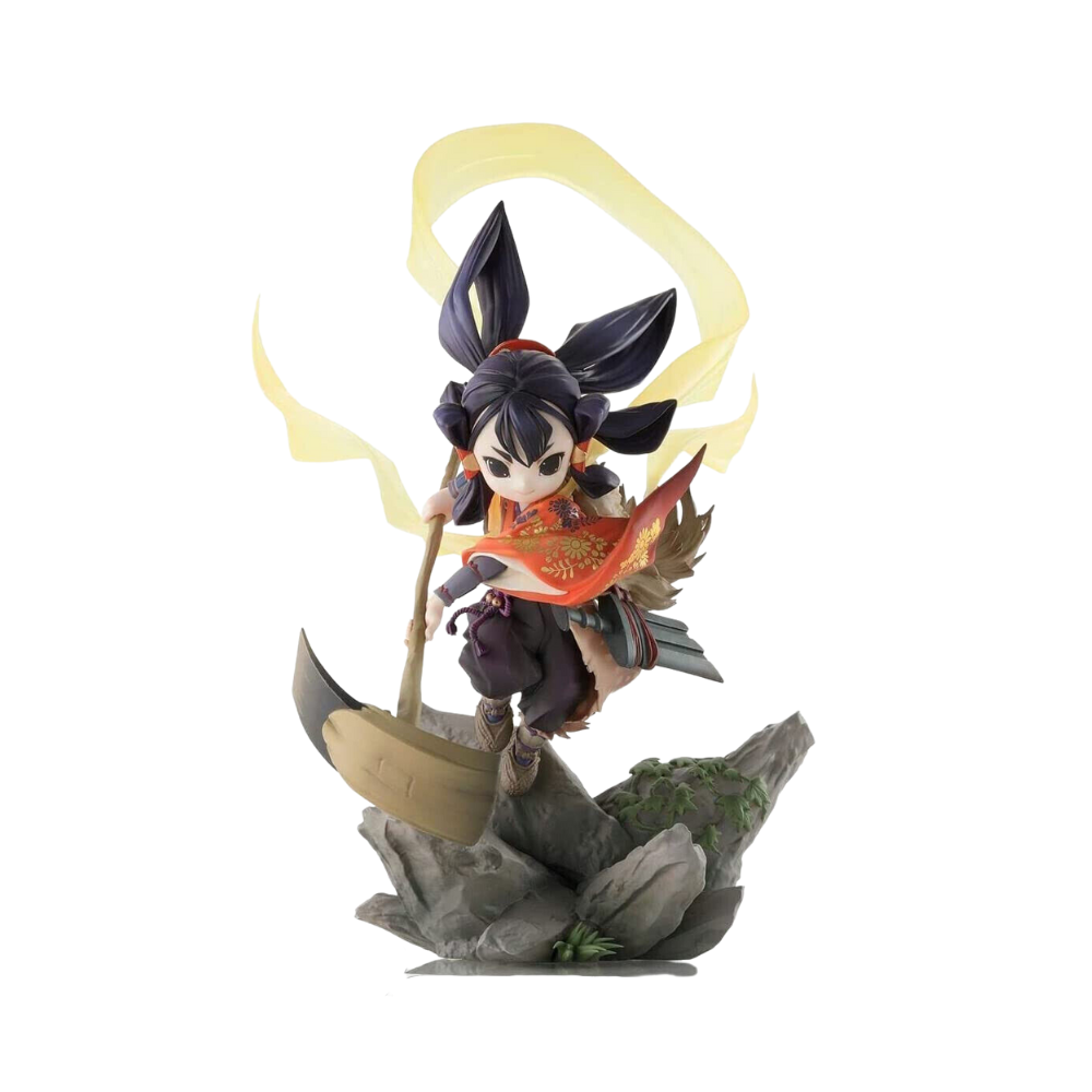 -Detailed kimono patterns, large sickles, straw shoes, and fluttering feather robes have been sculpted with attention to detail.