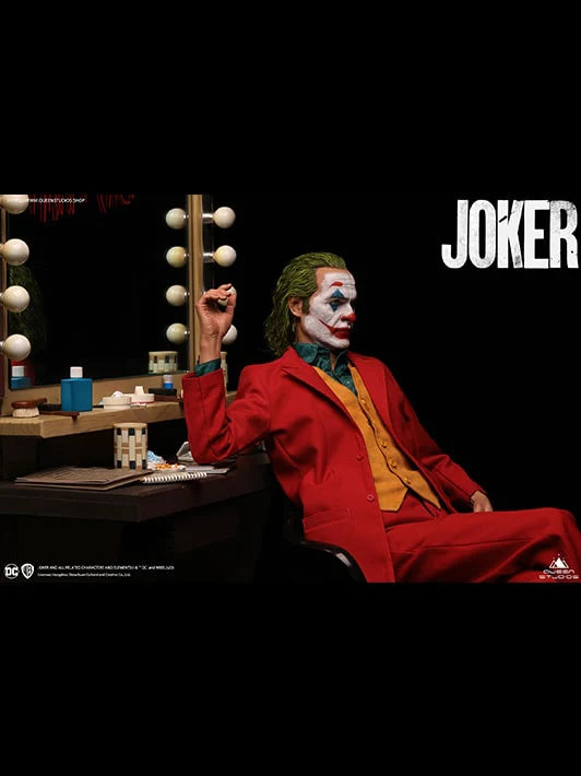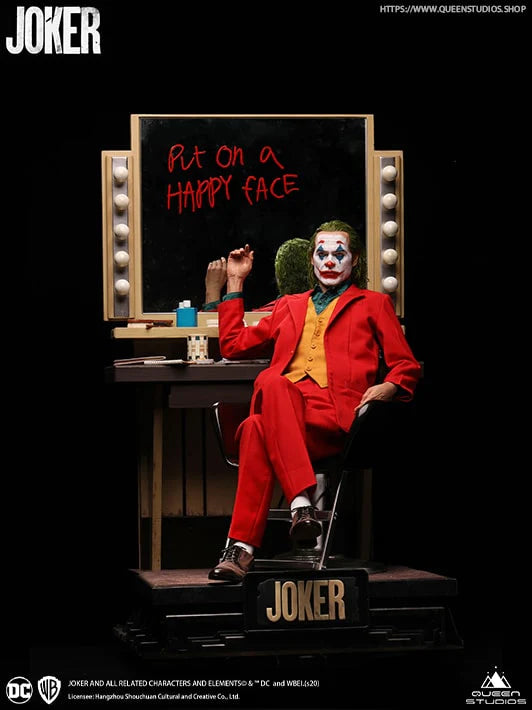 The Queen Studios team have carefully recreated one of the most iconic scenes from the 2019 Joker movie. As Arthur sits in his chair deep in thought. His legs crossed, one arm raised, who knows what twisted thoughts are running through his mind. No detail is spared, from his tailored clothing, to the bar of soap and brush on his dressing room table, and those immoral words inscribed on the mirror “Put on a HAPPY FACE”.