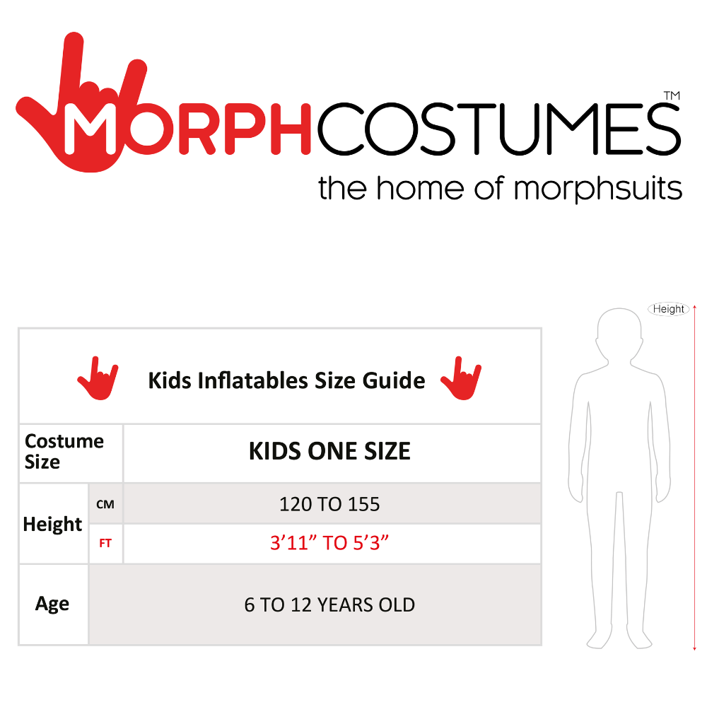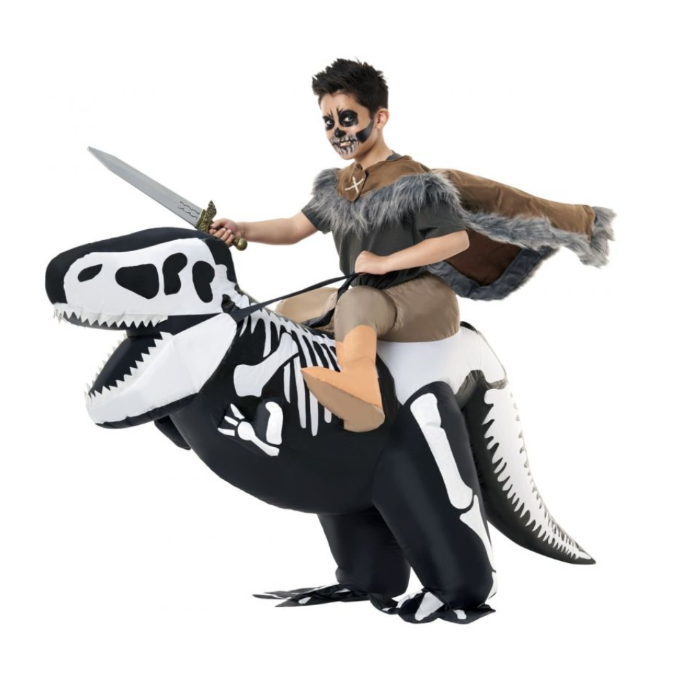 An undead warrior wouldn't ride something as simple as a horse now, would they? With the kids' Ride On T-Rex skeleton inflatable costume, your child can bring some real terror (and a few laughs) to their next Halloween party. Thanks to a clever optical illusion, this inflatable fancy dress costume will make your child look as though they are riding atop an undead skeleton T-Rex all night long.