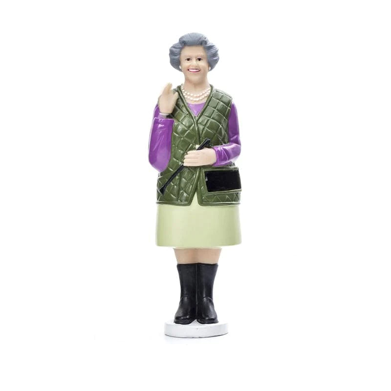 The Queen is going for a horseback ride in her riding outfit with her jacket, boots and whip. Give her a sunny spot and she'll give you a wave.