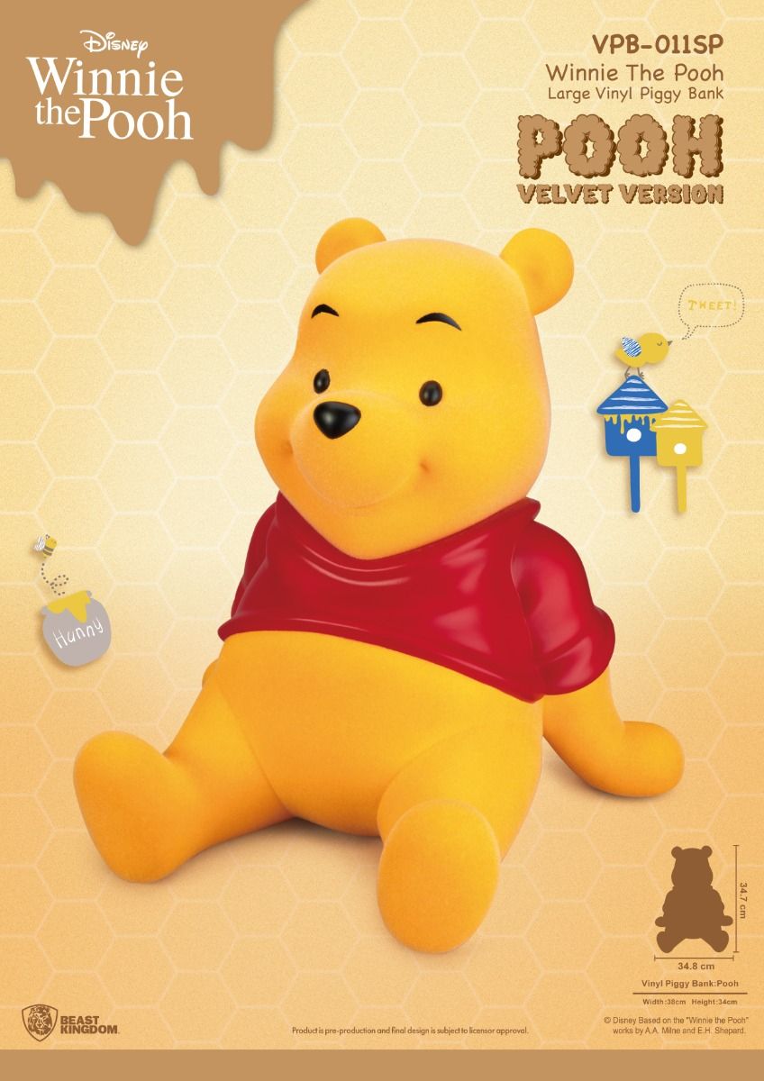 The limited special edition brings a flocked material shape, which further restores the fluffy feeling of Pooh plush. Feel confident when Pooh is fed with your hard-earned money that he will store them safely and securely. The wonderfully cute decoration and piggy bank is ready to adorn your desk and start saving for you as well, so order yours from an official Beast Kingdom outlet today!