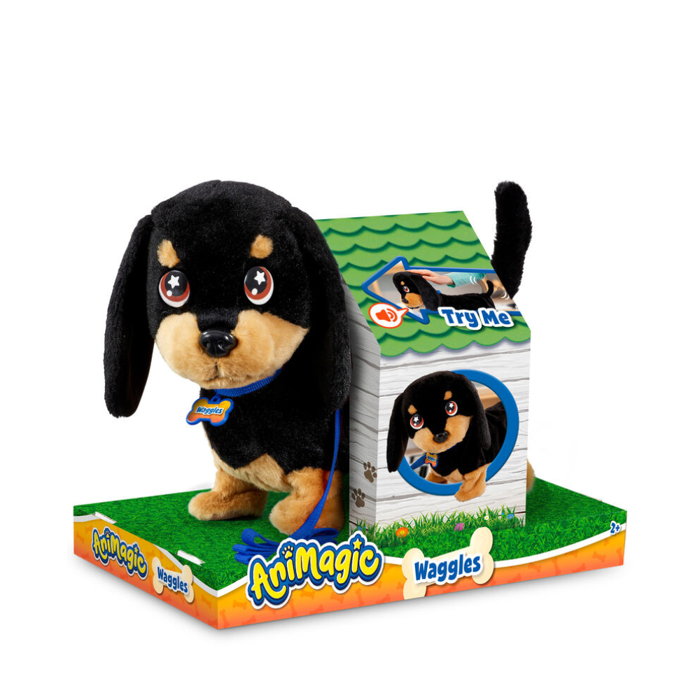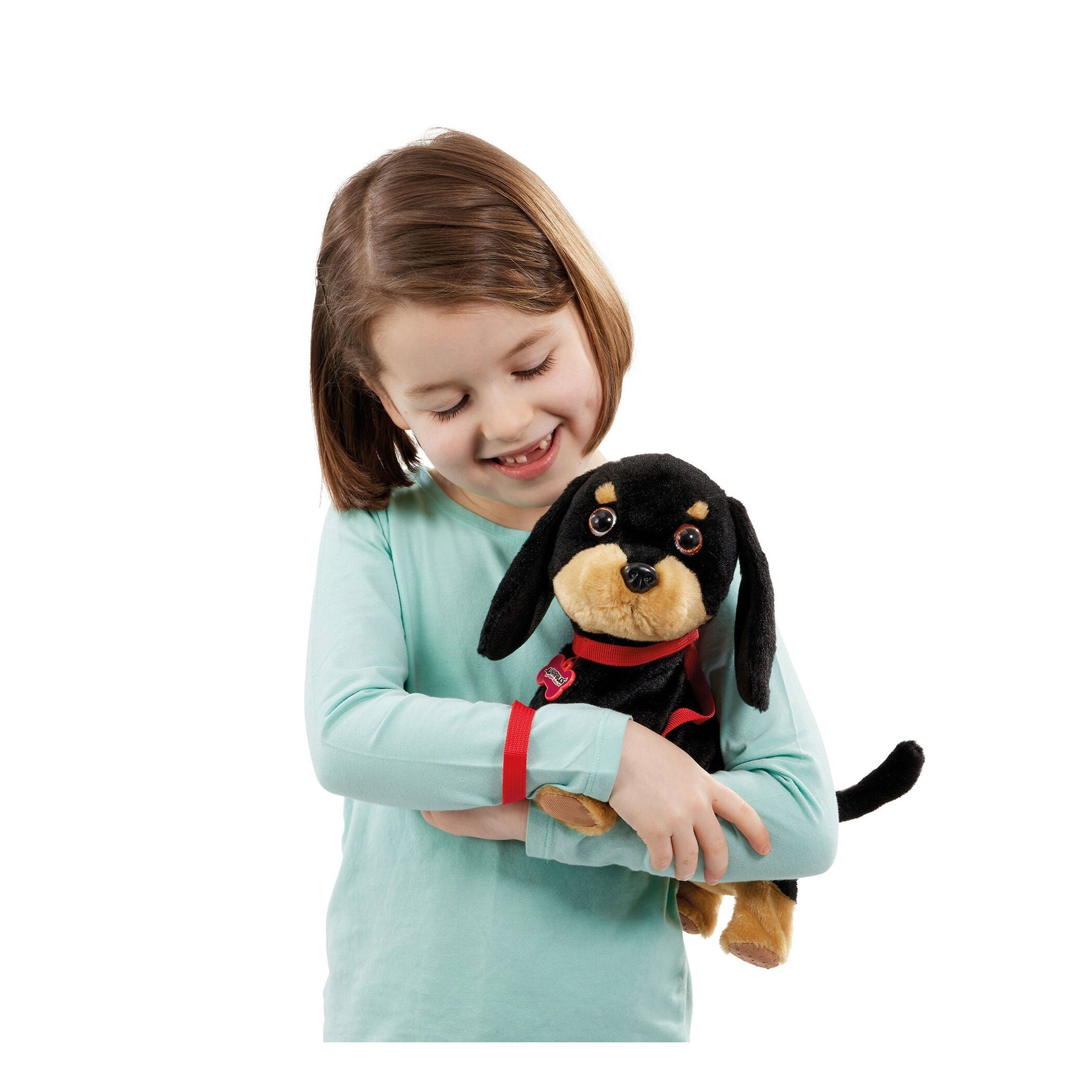 This super cute plush dog Waggles is just like the real thing! Do you want a sweet puppy in your house, but without all the worries and duties? Then Waggles is the answer. Waggles walks along the leash on his short dachshund legs. He wags his tail enthusiastically at his owner and when you stroke his head he starts barking happily. Fortunately, he can be left alone very well and is always well behaved. The ideal pet for children, but also for their parents!